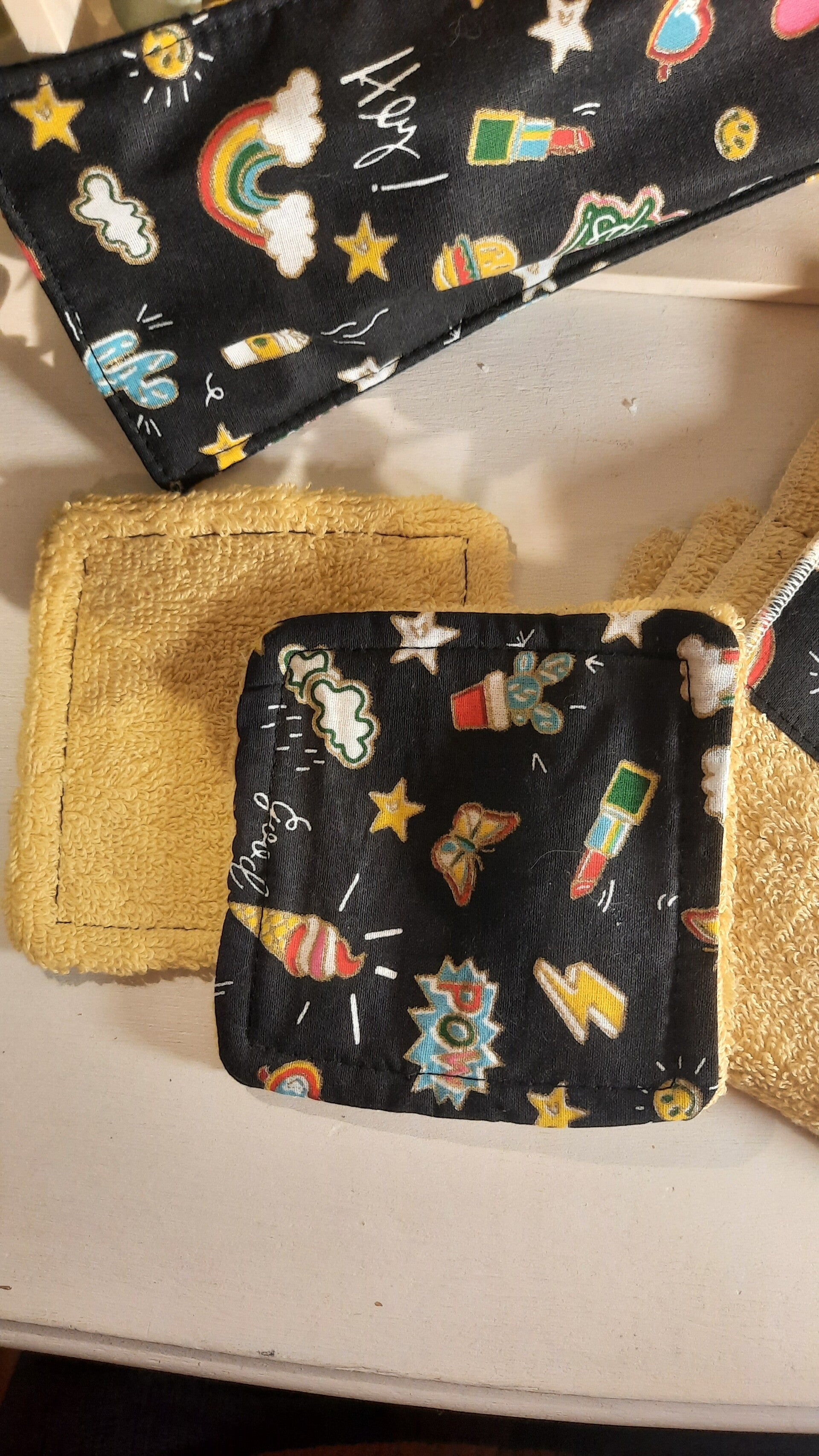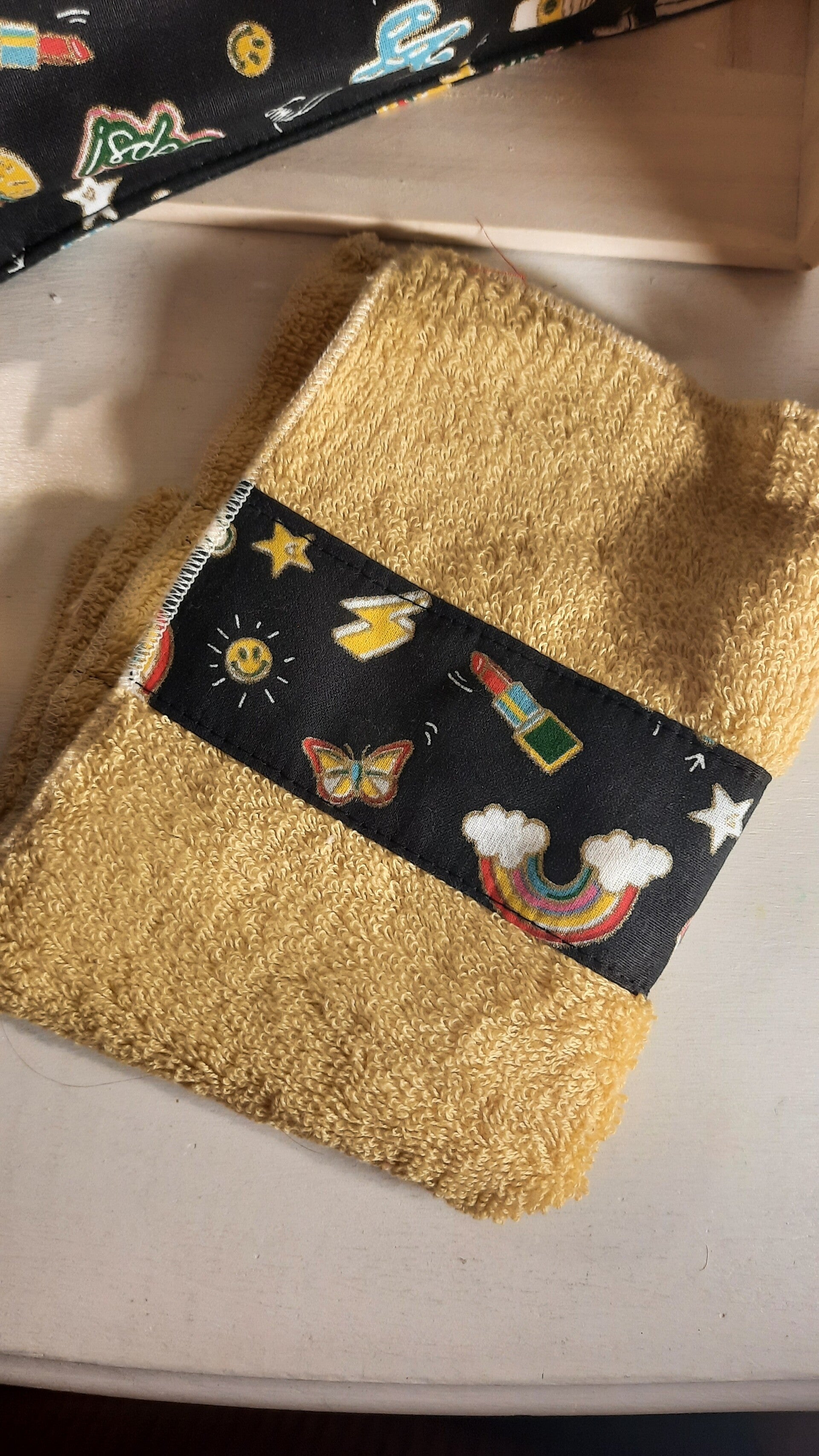 Cet ensemble contient un étui à brosse à dents (8cm x 22cm), une pochette à savon (9cm x 13 cm), deux lingettes (10 cm x 10 cm) et une mini serviette (23 cm x 28 cm)